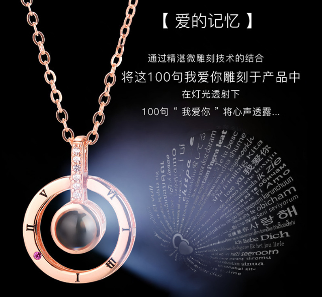 激光納米雕刻的出現就完美的解決了這一問題,納米微雕技術能將一百種語言的“我愛你”雕刻在方寸之間,使用肉眼是完全無法看見的,只有使用手機燈光或者手電筒對準項鏈,才會浮現出各種各樣我們肉眼看不見的文字。